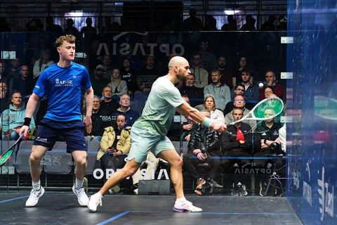 First and second game, Abou splendid, controlling – if we can call it that – the rallies and containing Mazen as much as humanly possible. A little wobble at the end of the opener, 10/4 Abou, with the nicks coming from all angles from Mazen’s racquet, but the Bullet finally closes it down 11/8, 16m. And if Mazen takes a good start in the second, 3/0, we are all levelled at 5/5, and it’s Abou again on top, 8/5 11/7 in 15m.