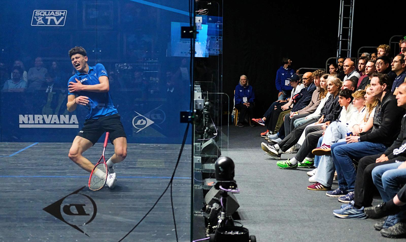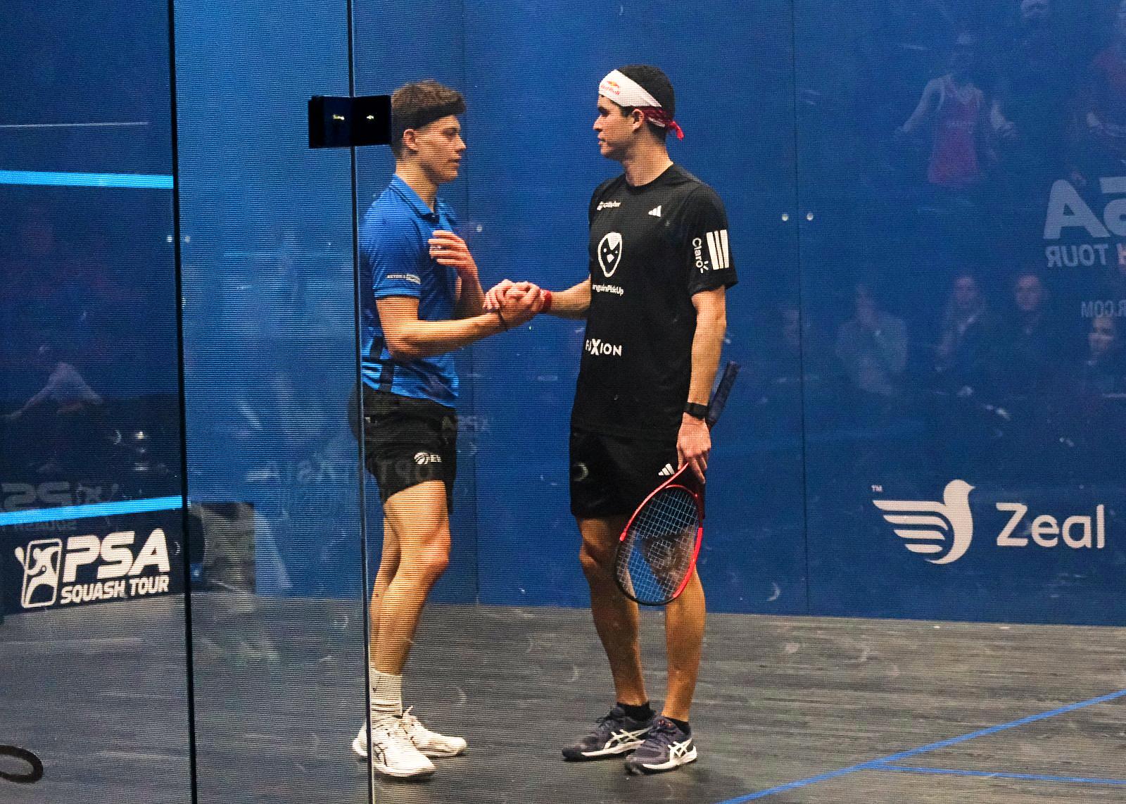 But at the point, Jonah dives to the left front corner, and lands awkwardly on his right shoulder. The PSA physio tries to assess and help, Jonah finishes the game courageously, bowing only 13/11 in 26m (23m real time), but cannot continue as the pain becomes unbearable for the young Englishman, 0/2 retired…